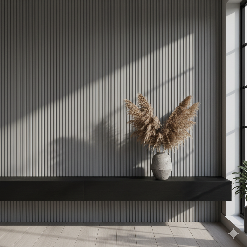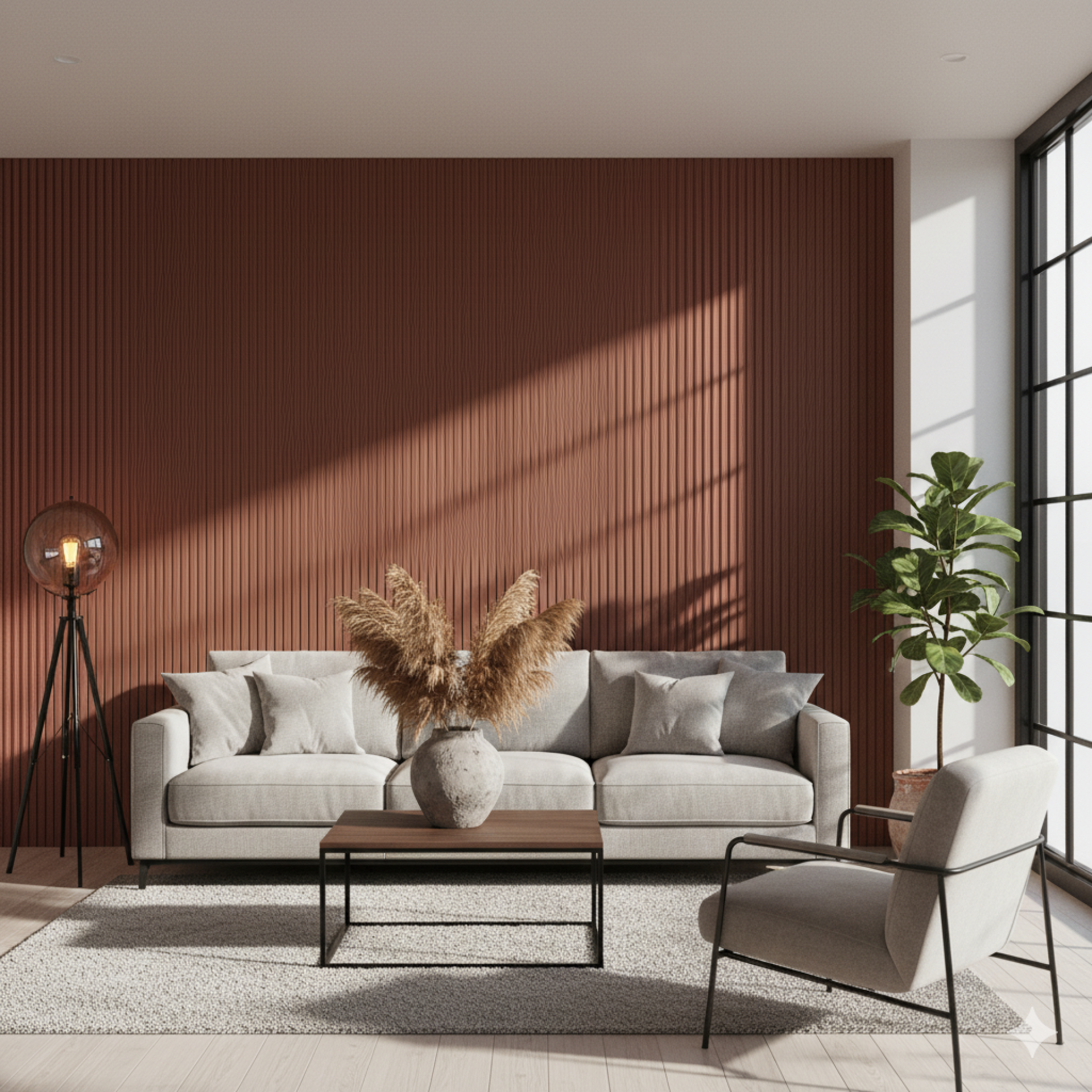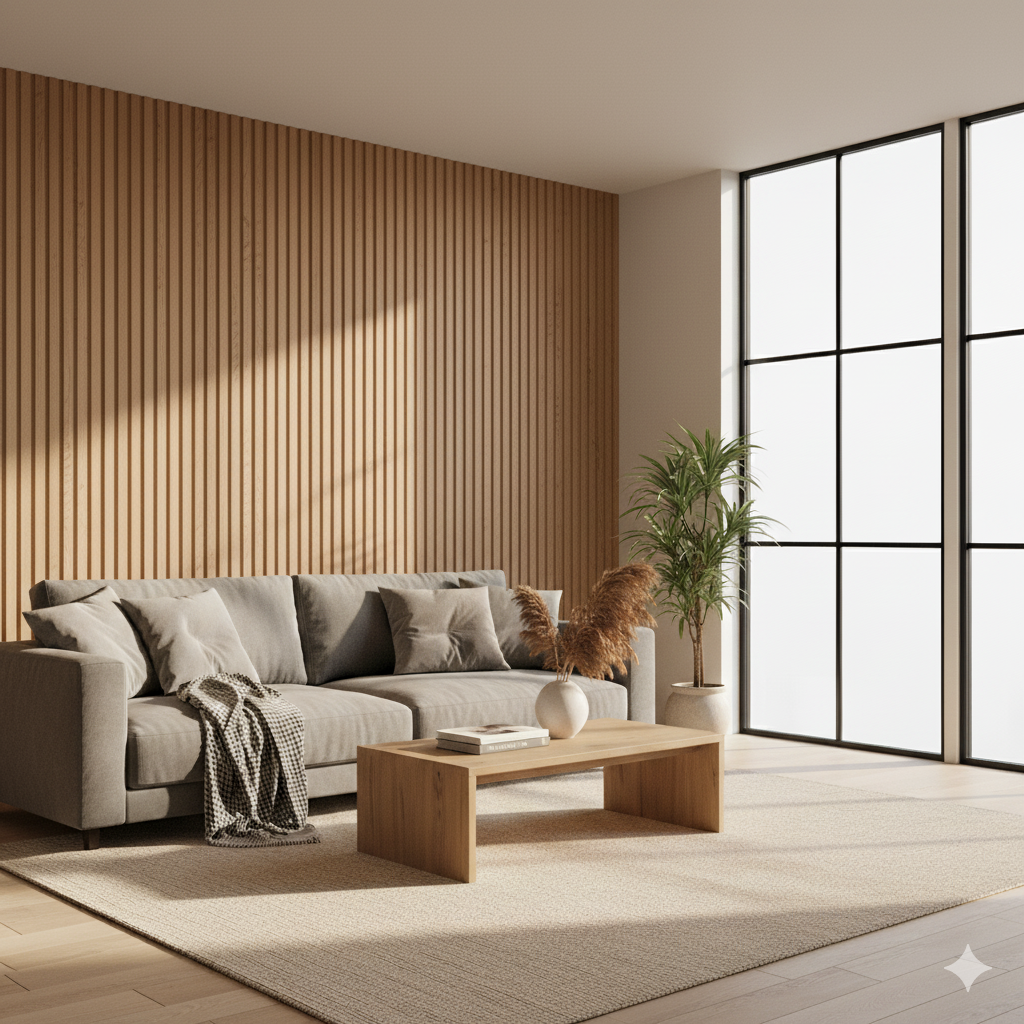 ผนังห้องนั่งเล่น ที่กรุด้วย WPC ลายไม้โทนอบอุ่น รับกับโซฟาสีเทาและแสงแดดยามบ่าย