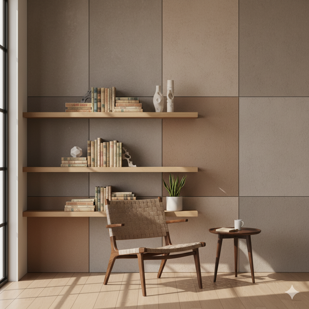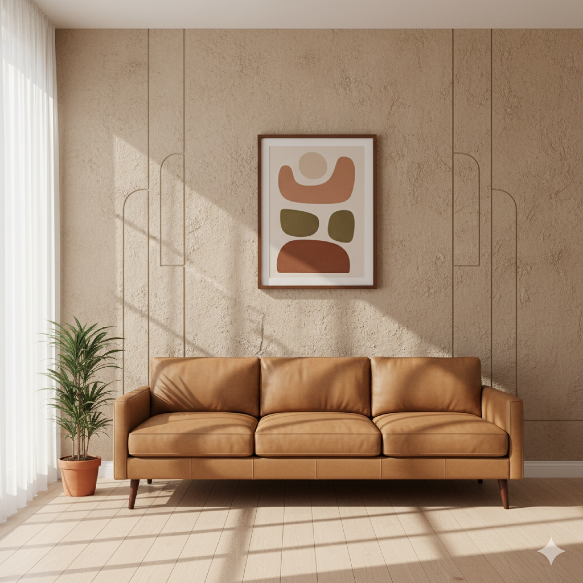 ใช้ผนังลายไม้โทนอุ่นหรือวัสดุลายดินธรรมชาติ ตกแต่งคู่กับเฟอร์นิเจอร์ขาเหล็กบาง และโซฟาหนังสีน้ำตาลอ่อน เสริมด้วยพรมลายเรขาคณิตเล็กน้อย