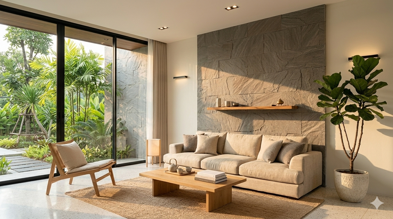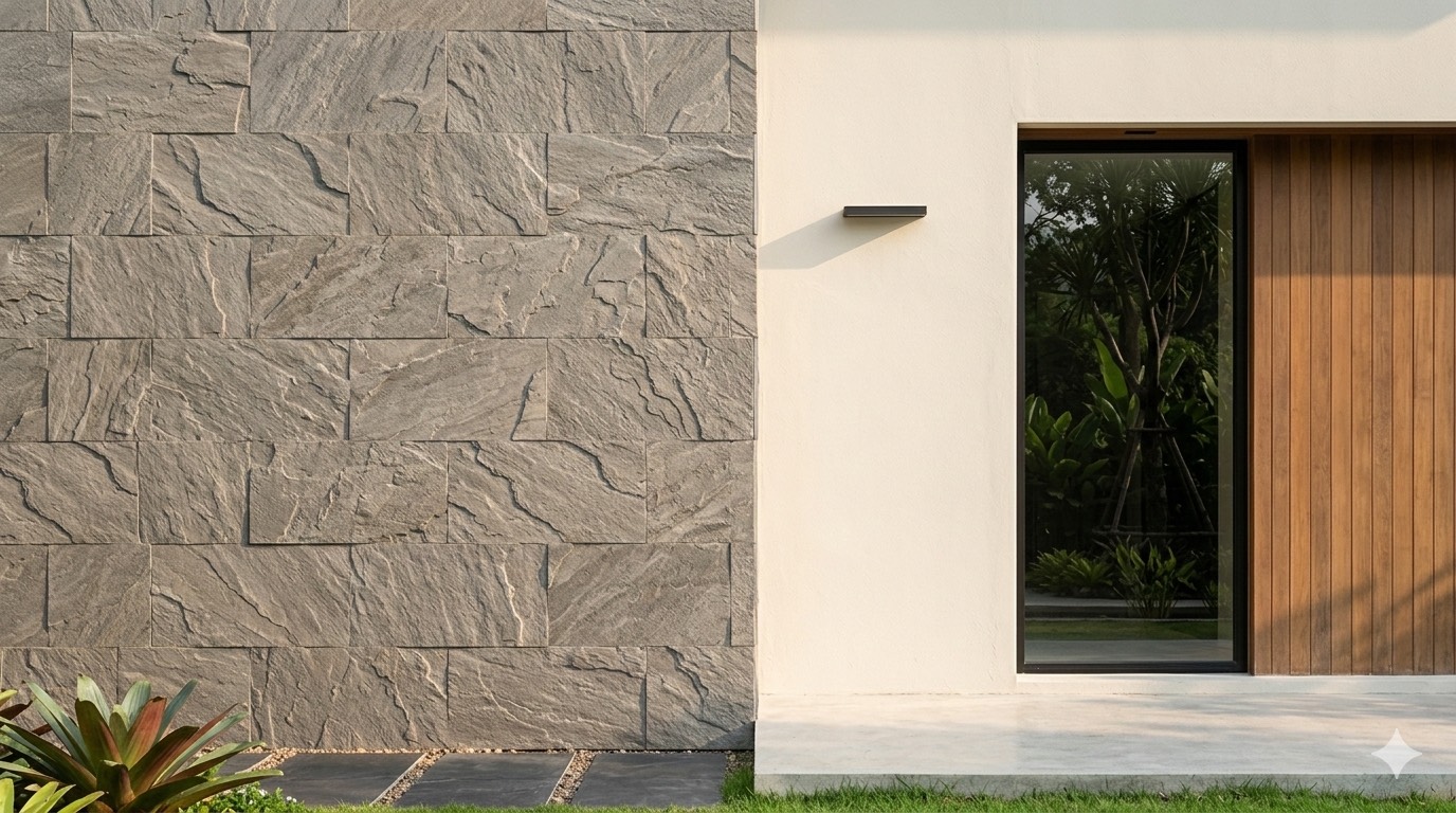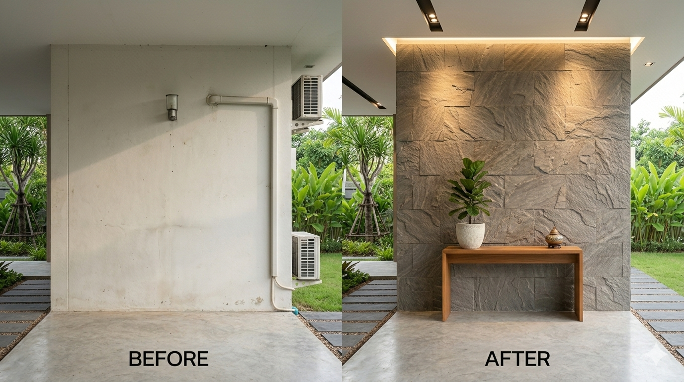 การตกแต่งผนังภายนอกด้วยวัสดุที่ให้ผิวสัมผัสเหมือนหินธรรมชาติ แต่น้ำหนักเบาและติดตั้งง่าย ช่วยเพิ่มมูลค่าทางสายตาให้บ้านทันที วัสดุอย่าง Stone Veneer จึงตอบโจทย์บ้านแนวโมเดิร์นและมินิมอลได้อย่างลงตัว