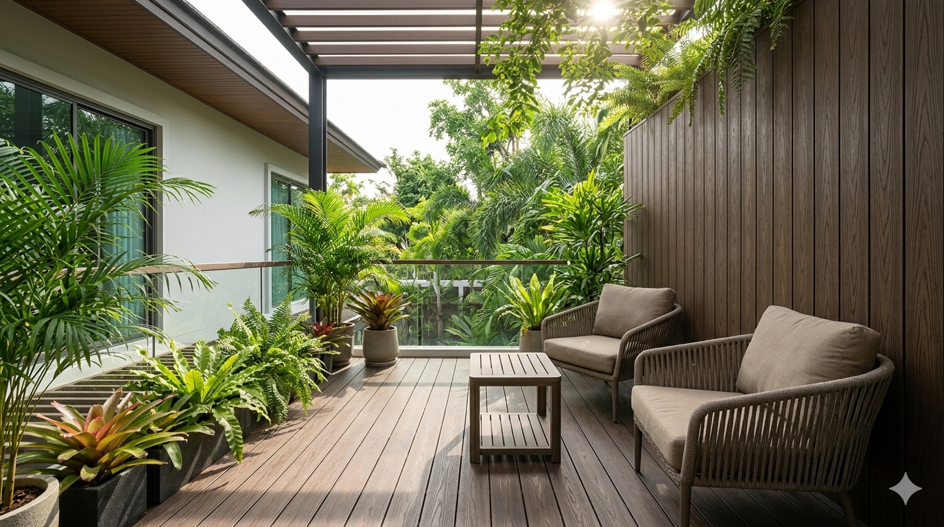 พื้นระเบียง ผนังกันแดด หรือฝ้าใต้ชายคา เป็นอีกจุดที่หลายบ้านเลือกปรับปรุง เพื่อให้สามารถใช้งานได้ทั้งในวันที่แดดจัดหรือฝนตก วัสดุที่ทนความชื้น ทนแดด และดูแลรักษาง่าย จึงเป็นตัวเลือกหลักในปีนี้